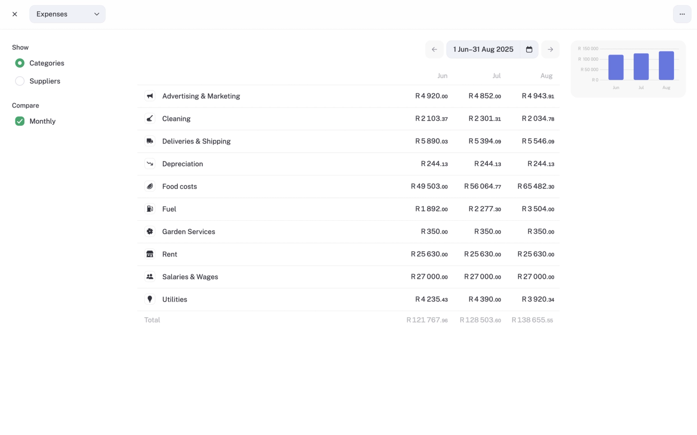 VAT is separate. The expense report only shows the net cost (without VAT). VAT itself lives under Liabilities, since you’re just holding it for SARS.