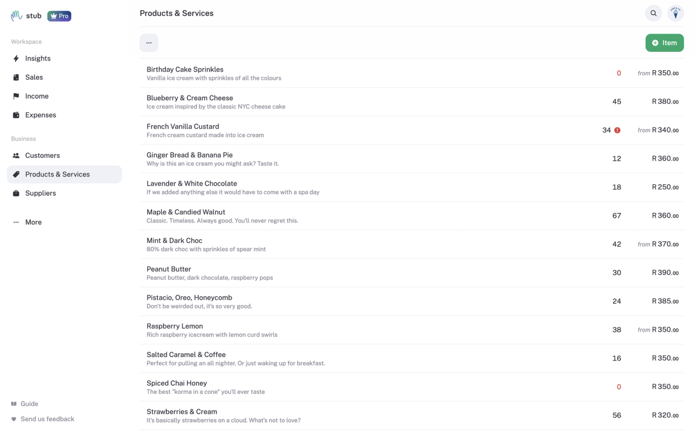 Example: You run “Glow Studio.” You add “Hydrating Facial” for R650 and “Hair Serum 200ml” for R250. The next time you invoice a client, stub does the admin for you; description, price, and all. You just click “send.”