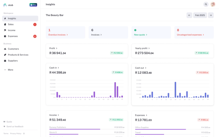 Monthly profit: your performance this month How you’re doing this month after expenses. stub shows decreases in profit in red so they don’t get lost in the numbers.