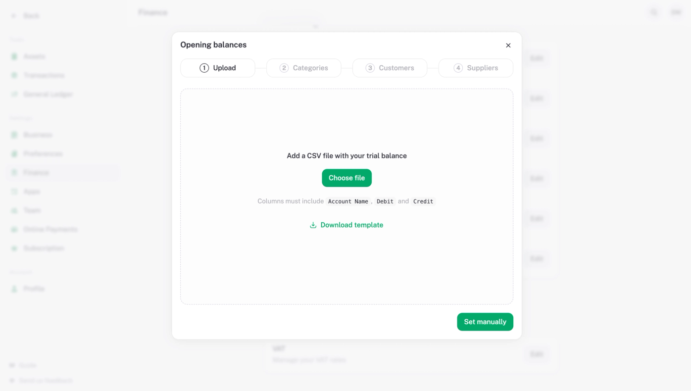 3. Create a trial balance: We've popped a downloadable CSV template in the opening balances section - three columns: account name, debit, and credit. Fill it in, make sure both sides balance, and you're good to go.
